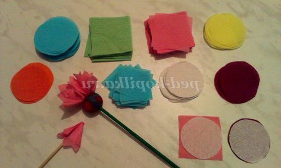 І таким же способом, як і в першому варіанті квітів, "торцюємо" на пластиліні "пелюстки" з приготованих заготовок круглої і квадратної форми. Пелюстки рівномірно маємо на пластиліні на 1/2 частини кульки, а потім робимо торцювання з серветок зеленого кольору.