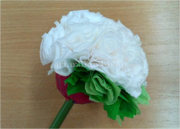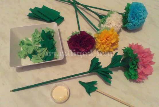 Решту пластиліну обертаємо шматочком зеленої серветки. Наші квіточки готові, залишилося приклеїти листя.