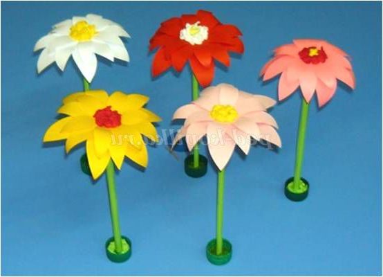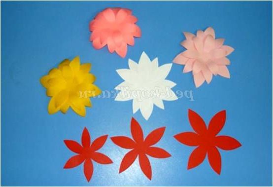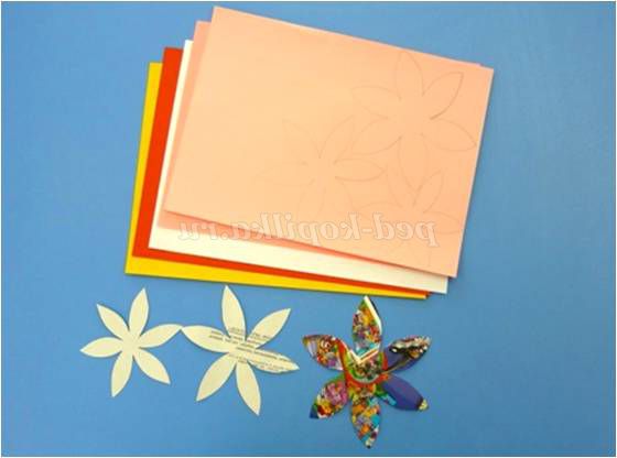 З картону вирізати трафарети кольорів (п'яти або шести пелюсткові) трьох розмірів. Обвести трафарети на папері, вирізати заготовки кольорів