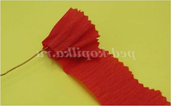 4.Полоску паперу червоного кольору обмотуємо навколо петельки, роблячи невеликі сборочки (як би пришипывая).