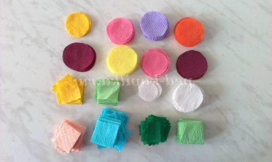 З серветок вирізаємо кола, квадрати різного кольору і розміру, квадрати зеленого кольору.