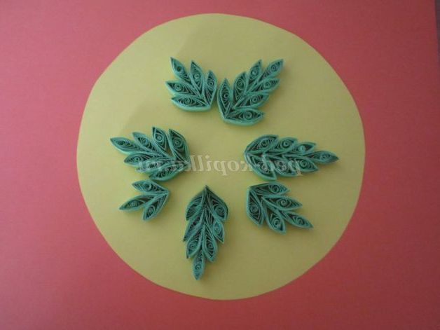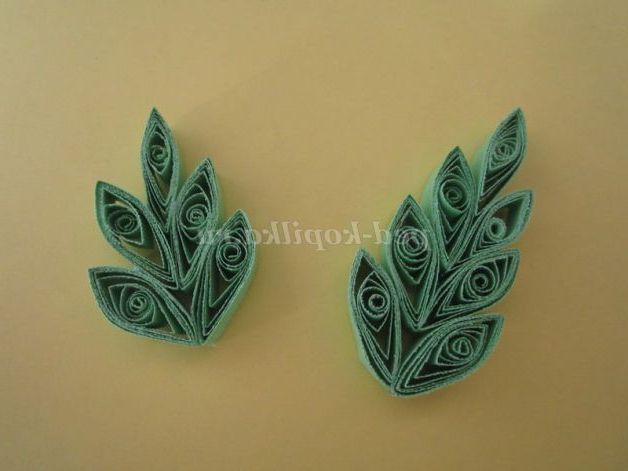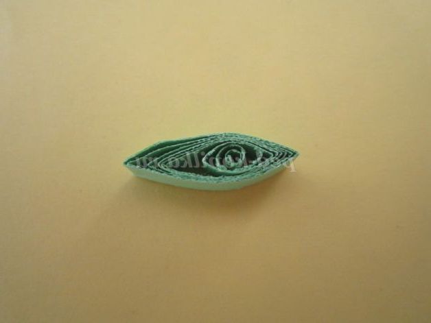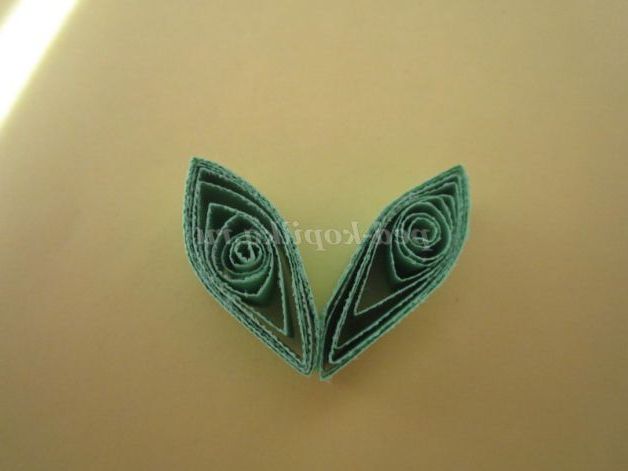 10. Із смужки зеленого кольору скрутіть вільну спіраль і надайте їй форму листочка, стиснувши з двох сторін. Склейте листочки попарно.