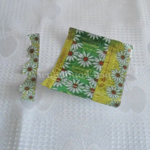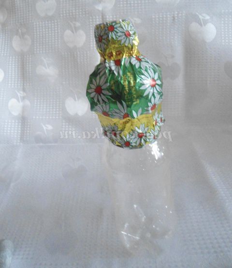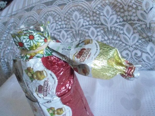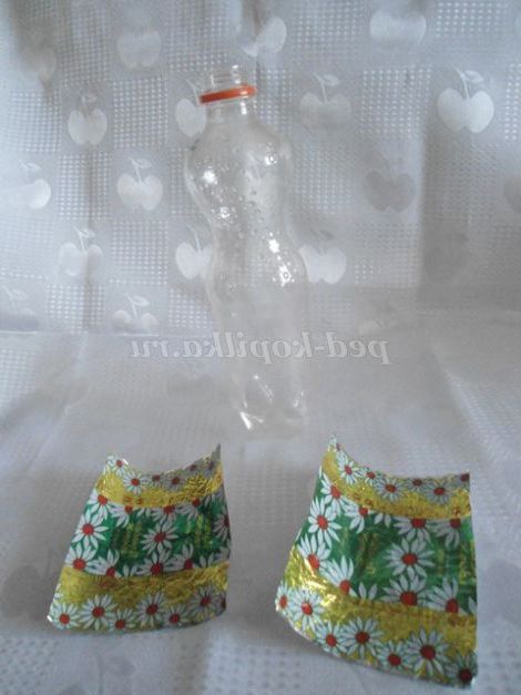 2. Починала роботу з наклеювання фантиків на пластикової пляшки зверху, з блузки: спочатку зібрала краю 2-х фантиків у пляшки, попередньо намазавши клеєм. Щоб краще прилягало, можна прив'язати ниткою, кінці роботи нитку прибрати.