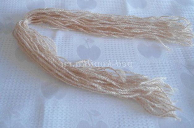 7. Волосся роблю з ниток : намотую велику пасму для коси (вона має бути довший тулуба, тому що при плетінні вона зменшується) і маленьку для чілки, посередині перев'язую.