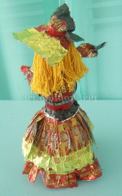 3. Для сарафана склеїла за два фантика, підібравши візерунок, вирізала трапеції, склеїла їх між собою і одягла сарафан на тулуб ляльки. Вирізала ажурну крайку фантика, вийшов гарний поясок, який підкреслив талію ляльки.