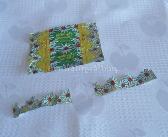 5. Вирізаємо з фантика смужки для лямок сарафана і приклеюємо їх.