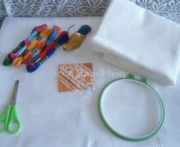 1.Материалы: п'яльця (діаметром 18 див), нитки муліне (для вишивання використовуємо в 4 складання), голки з широким вушком ( довжиною не більше 3 см), ножиці (розміром близько 140 - 170 мм), ігольніцю на кожну дитину, тканина - щільна вафельний полотно з квадратними клітинами, смужки картону з розміткою для виконання ряду горизонтальних хрестиків. (фото 1).