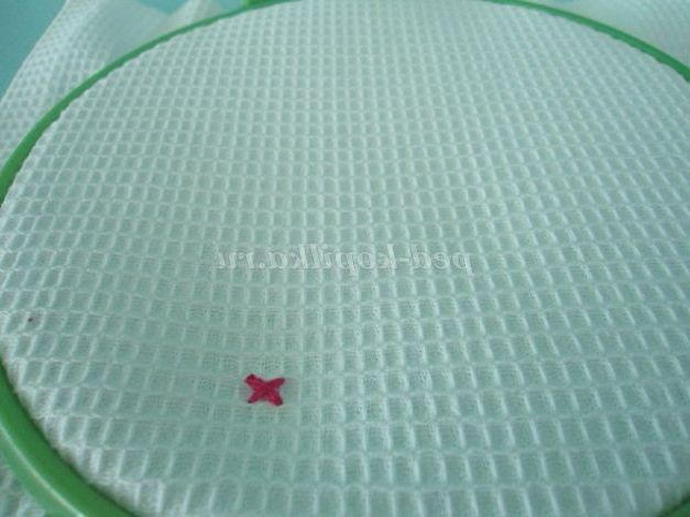 9. Починаючи вишивати ,потрібно закріпити нитку на тканині. Вузликів на нитці при вишиванні не робимо! Проколюємо верхній правий кут першої клітини і виводимо голку в нижній лівий кут (фото 9)