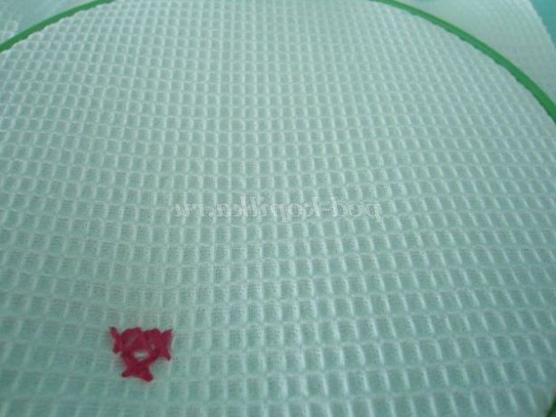13.Когда нитка закінчується її необхідно закріпити: на виворітній стороні поруч з другою ниткою знаходимо стібок і в нього протягуємо голку з ниткою, і в петлю протягуємо знову голку з другою ниткою. Вийти вузлик. Можна для міцності повторити ще раз. І відрізаємо нитку. (фото13, 13а, 13б)