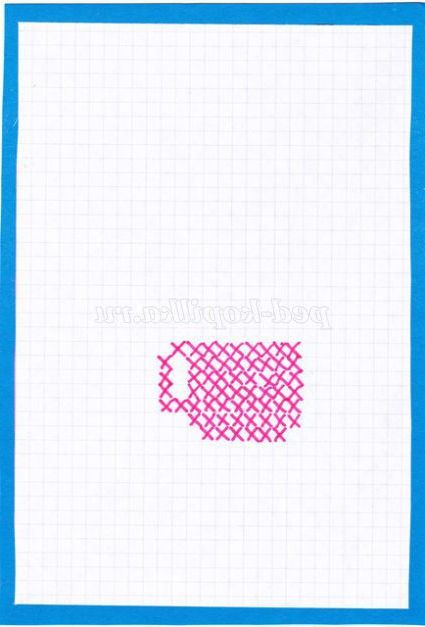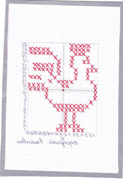 6.Начинаем вышиванье знизу вгору з визначення місця для першого хрестика. Вишивка хрестиком відноситься до лічильної вишивки, тобто потрібно вважати клітини. Розглядаємо схему, знаходимо найдовший горизонтальний ряд хрестиків, на ньому знаходимо середину, вважаючи клітини. Проводимо простим олівцем пряму лінію за допомогою лінійки і укладаємо візерунок в квадрат або прямокутник, при вишиванні буде зручно вважати клітини. (Фото 6)