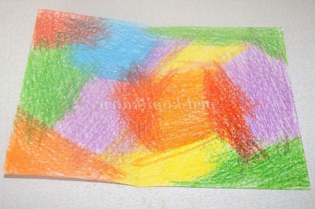 Розфарбувати аркуш паперу кольоровими восковими олівцями. Олівець повинен покрити лист щільним шаром.