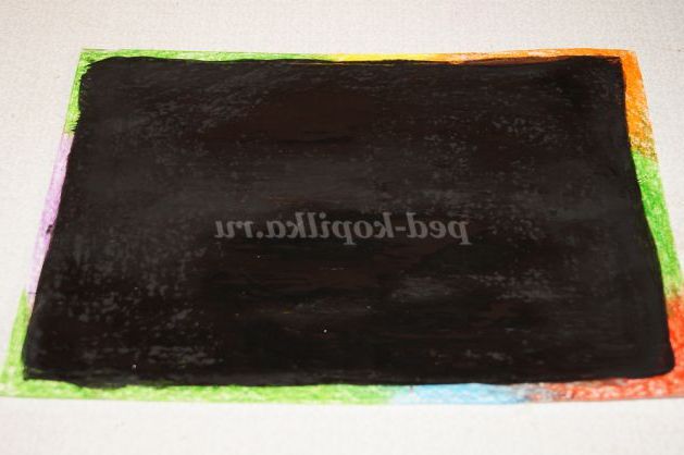 Покриваємо малюнок чорною гуашшю. P.S гуаш краще перемішати з рідким милом для більш рівномірного нанесення фарби. Отриманою сумішшю покрити аркуш за допомогою пензля.