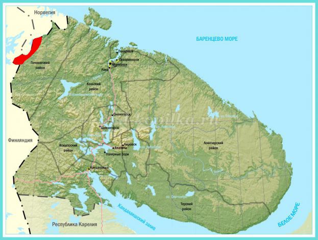 Користуючись картою Мурманської області, познач територію заповідника «Пасвик».