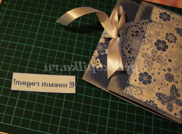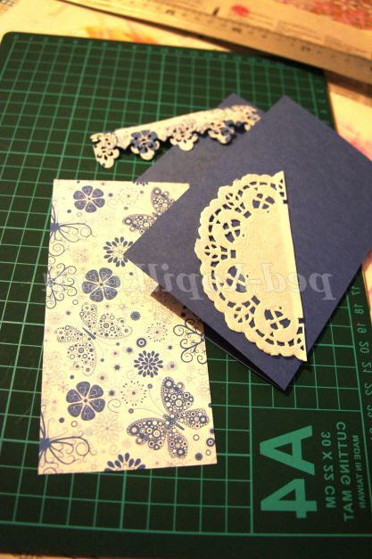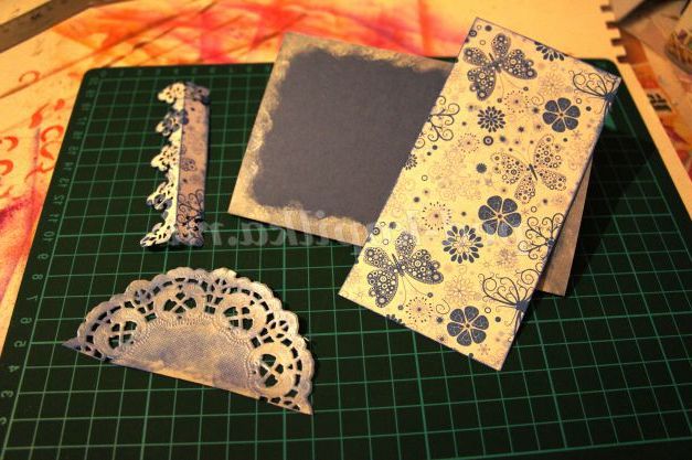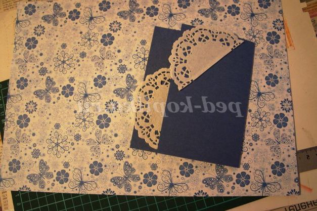 І так, беремо папір синього кольору і вирізаємо прямокутник зі сторонами 30 х 15 див. Складаємо її так, щоб вийшла листівка з різними за розміром сторонами. Серветку розрізаємо посередині, нам потрібно тільки одна частина серветки.