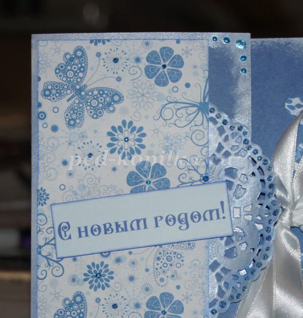Приклеюємо прямокутник скрап паперу на вузьку частину лицьової сторони листівки, трохи захопивши обрізану бік листівки. Залишається тільки розмістити напис «З Новим Роком» і декоративним гелем виділити центри у квітів. Ось і все, листівка готова.