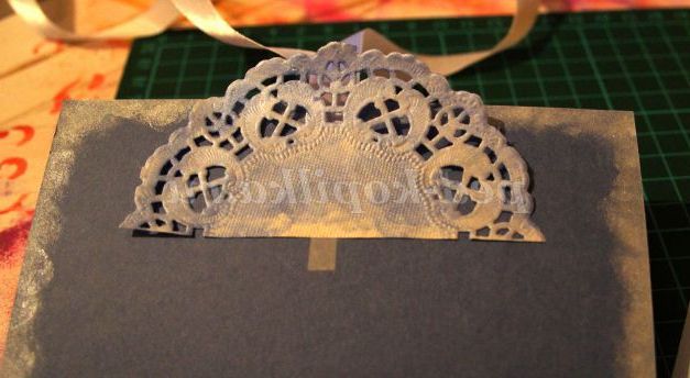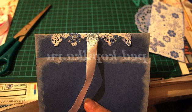 На другій половині листівки з лицьового боку приклеюємо ще одну стрічку і закриваємо її серветкою струм, щоб серветка трохи виглядала за край листівки.