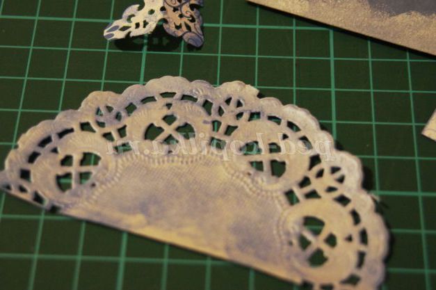 Зі скрап паперу вирізаємо прямокутник зі сторонами 7 х 13см., і невелику смужку (нею ми будемо закривати місце приклеювання стрічки). На смужці фігурним дироколом вирізаємо візерунок.