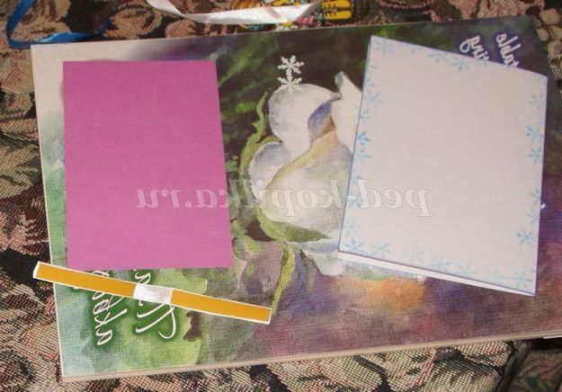 З білого паперу вирізаємо прямокутник 21х15, згинаємо по широкій стороні, отримуємо основу для листівки. З рожевої папери одержуємо прямокутник зі сторонами 10х14.
