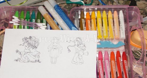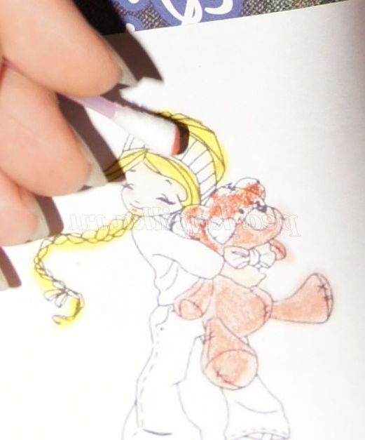 Підтінюємо обличчя і руки олівцем тілесного кольору, додаємо рум'янець (на жаль на фото не дуже видно колір особи і рум'янець на щоках), волосся зробимо жовтенькими. Все акуратно растушуем ватною паличкою.