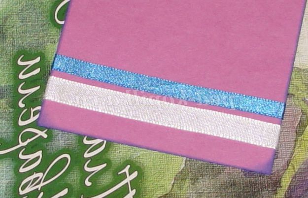 Підклеюємо на двосторонній скотч до рожевого прямокутника стрічки потрібних нам кольорів (я взяла білу і синю стрічки).