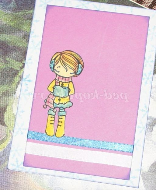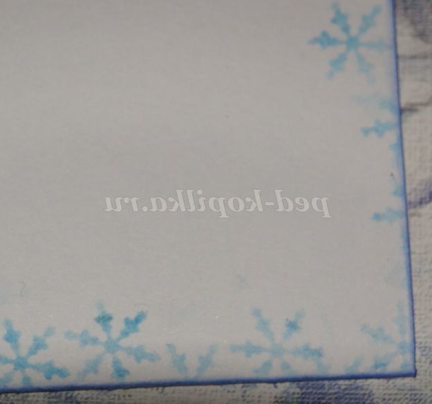 За допомогою фігурного діркопробивача на простому аркуші вирізаємо сніжинки, прикладаємо його на білу листівку і за допомогою штемпельної подушки створюємо легкий фон. Підтінюємо краю листівки і рожевого прямокутника.