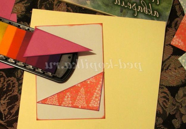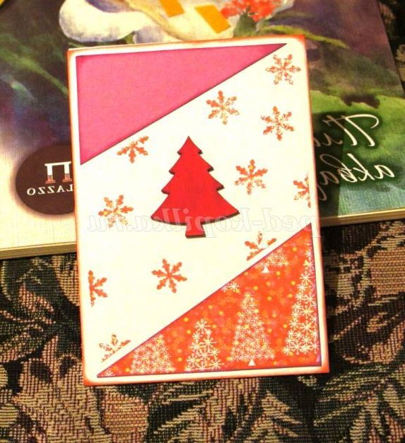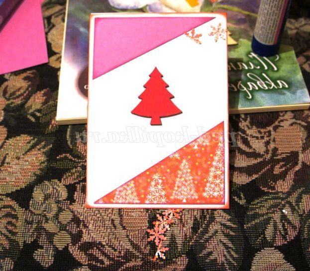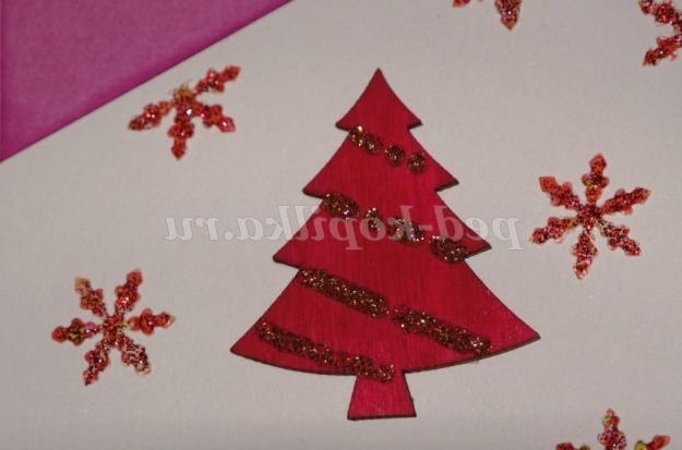 Підклеюємо трикутники на двосторонній скотч. Дерев'яну ялинку попередньо пофарбуємо в червоний колір акрилової фарба сохне така фарба швидко і покривати лаком виріб в подальшому не потрібно). Ялинку також підклеюємо на двосторонній скотч у центр листівки.