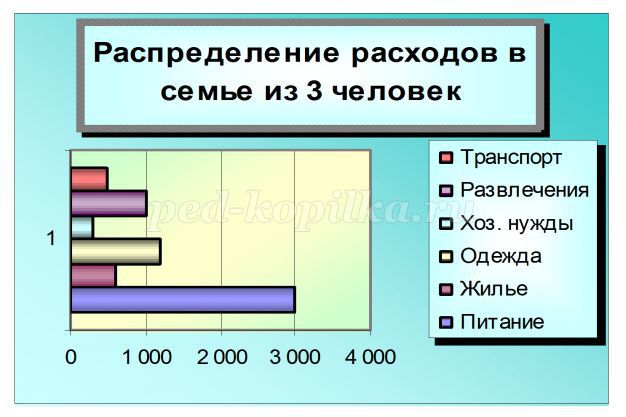 Розглянемо малюнок 8. На ньому інформація про розподіл видатків на людину в місяць дана у вигляді діаграми . Як ви думаєте, яка інформація на цій діаграмі розташована горизонтально? (Вид витрат) А вертикально? (Сума витрат) У вигляді якихось фігур представлені види витрат на діаграмі? (Стовпчики) Як може називатися така діаграма? (Стовпчикова)