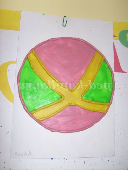 - Щоб вийшов малюнок на іграшці, починаємо роботу саме з нього. Наприклад, у м'яча спочатку ліпимо жовті смуги, а потім зафарбовуємо решта 4 частини.