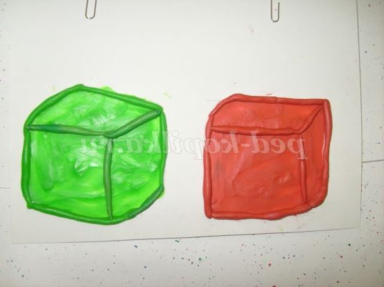 Діти продумують і висловлюють свої побажання педагогу. Педагог заохочує вибір дітей і нагадує алгоритм ліплення. Відщипуємо маленький шматочок пластиліну, катаємо тонкі ковбаски, викладаємо по контуру предмета і розмазуємо тонким шаром.