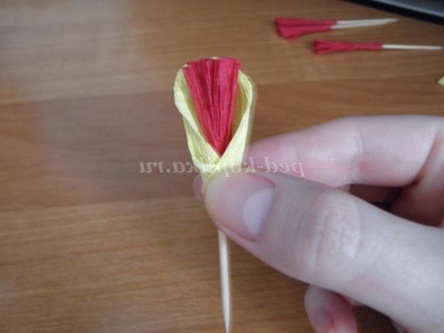 Крок 5. Саму зубочистку обертаємо зеленим папером, додаючи пелюстки.