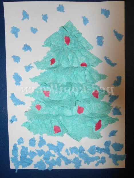 Кольоровий папір різних кольорів рвемо на дрібні шматочки і починаємо прикрашати нашу ялинку.