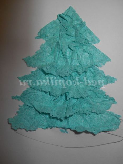 Приклеюємо серветку наступним чином. Нижній край кожного ярусу приклеювати не потрібно, під нього приклеюємо наступний ярус ялинки.