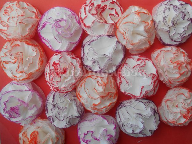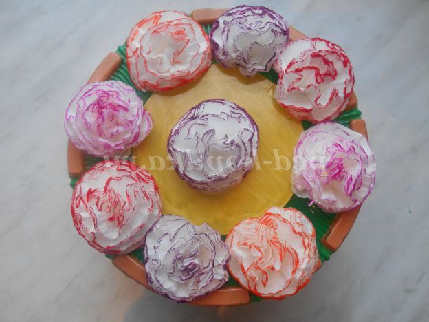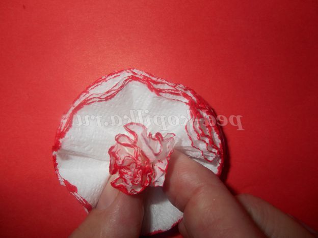 Розфарбовуємо краю з допомогою фломастера, починаємо формувати квітки шляхом збирання і стискання кожного шару до центру.