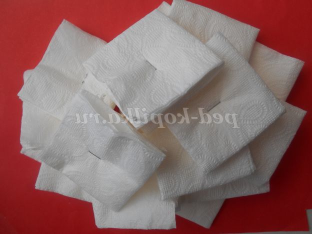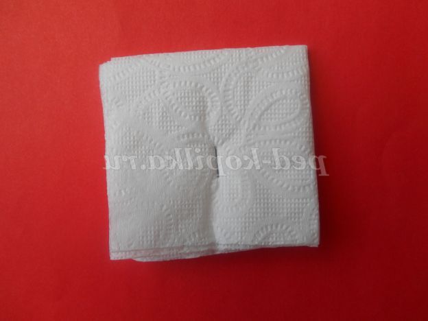 Тепер робимо квіти для прикраси. Паперову серветку складають вчетверо, закріплюємо в середині за допомогою степлера.
