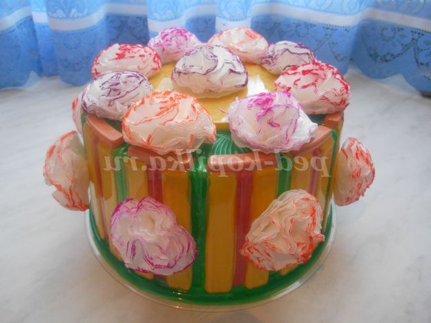 Додаємо прикрас збоку, ми приклеювали квіти через дві смужки на торті. Торт готовий.