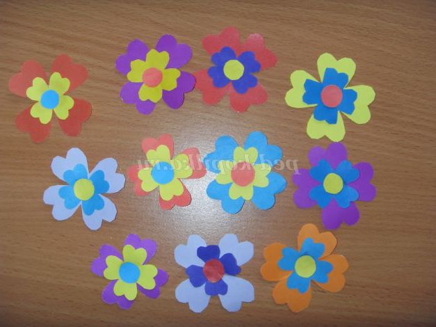 7. Складемо квадрати вчетверо, докладемо шаблон у вигляді сердечка так, щоб гострий куточок перебував у центрі майбутнього квітки, і обведемо його (великий шаблон для великого квадрата, маленький - маленький). Виріжемо і розгорнемо квіточки. Із залишків вирізаємо кружечки для серединки квітки.