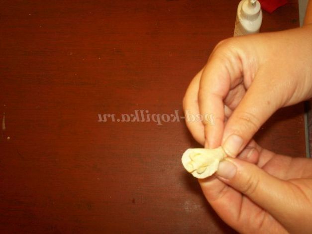 Потім склеюємо наші пелюстки і стовбур для троянди. Для цього змащуємо клеєм наш пелюстка і закручуємо в нього наш стовбур. І так пелюсток 10.