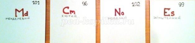 (Ейнштейн - эйнштейний, Нобель - нобелий, Менделєєв - менделевий, Кюрі - кюрій)
