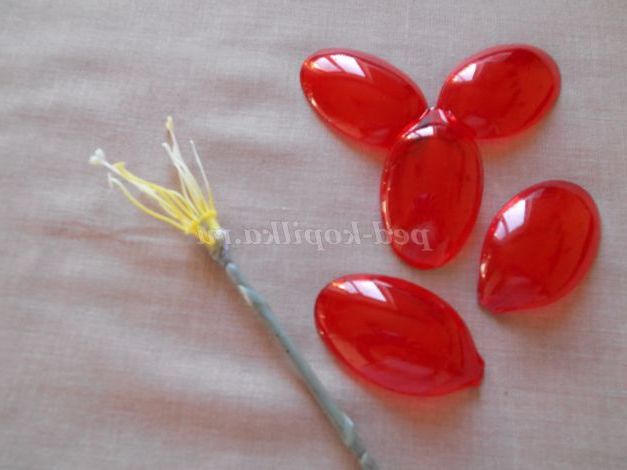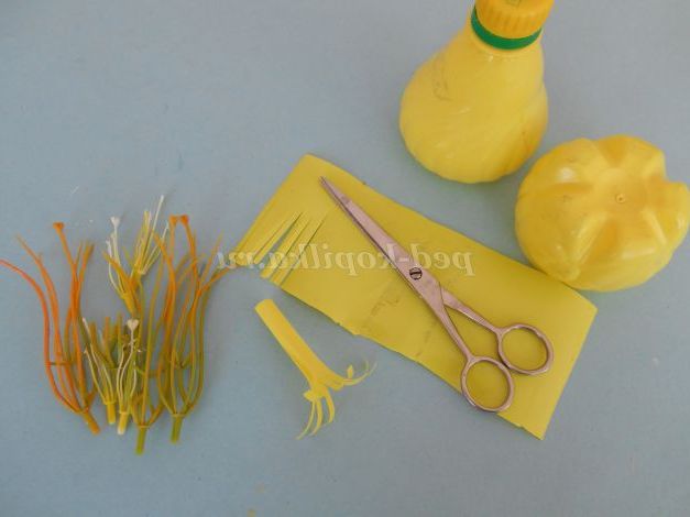 Візьміть жовту пластикову пляшку. Розріжте її і з середньої частини, зробіть тичинки. Можна скористатися тичинками від старих штучних квітів.