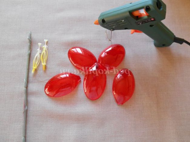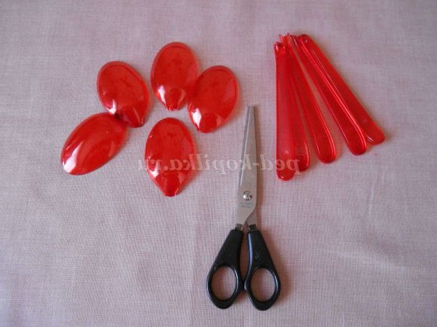 Візьміть 5 червоних ложок, відріжте від них ручки. Хочу дати пораду. Кольорові ложки більш міцні, глянцеві. Вони важко відрізаються. Скористайтеся свічкою. Нагрійте трохи над вогнем ручку і пластик легко отрежется. Край буде гладким. Тільки не тримайте ложку близько до вогню, почорніє. Підготуємо для складання тюльпана всі п'ять ложок.