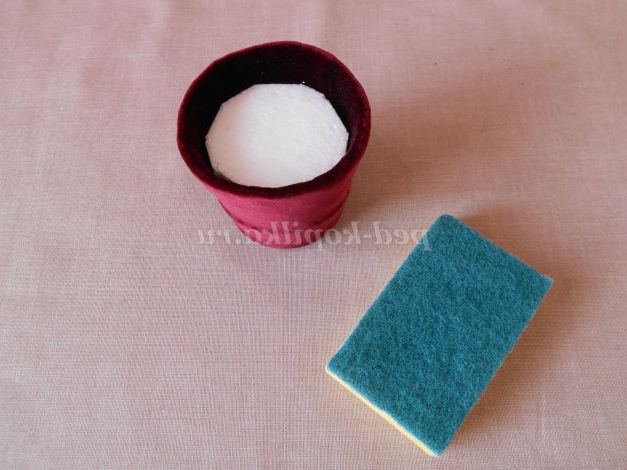 Посадимо наш тюльпан. Я взяла торф'яної горщик, рукав від старого оксамитового плаття, зелену губку і шматочок пінопласту. Ось такий оксамитовий, ошатний горщик вийшов.