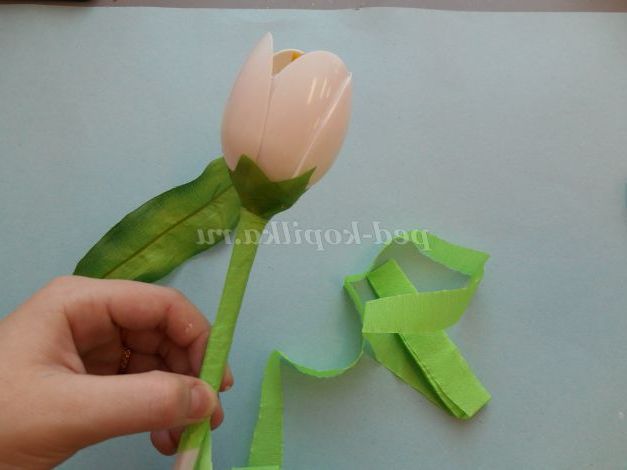 Відріжте від гофрованого паперу вузьку смужку і обмотайте стебло квітки. Можна використовувати флористичну стрічку, нитки. Все, що знайдеться у вашому чарівному скриньці.