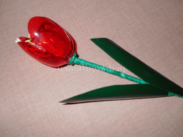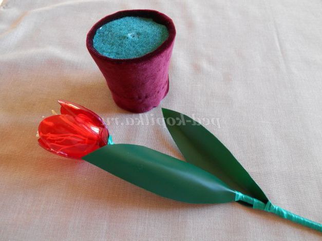 А якщо у вас знайдуться червоні, жовті або іншого кольору ложки, зробіть тюльпан і посадіть його в красивий горщик. Такий тюльпан можна подарувати мамі, бабусі в день 8 березня, ветерана в день Перемоги. Я впевнена, що подарунок припаде їм до душі.