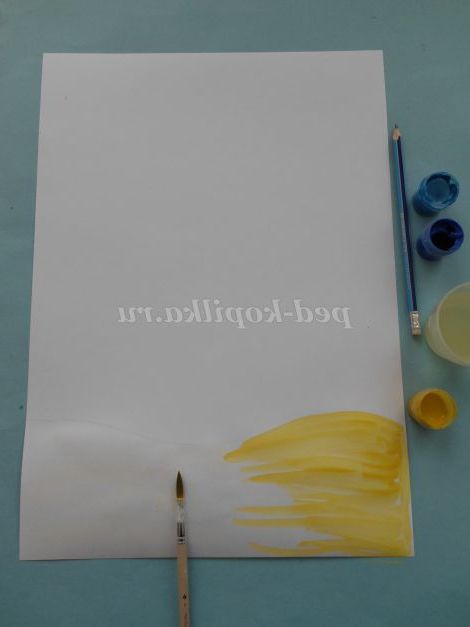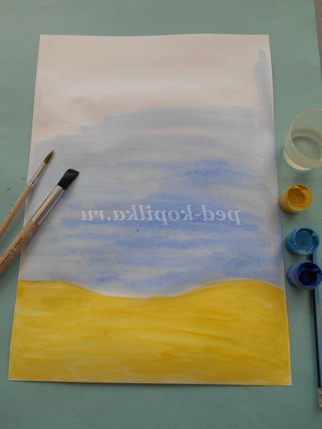 На аркуші ватману малюємо піщаний берег і море, використовуючи прийом малювання по мокрому.