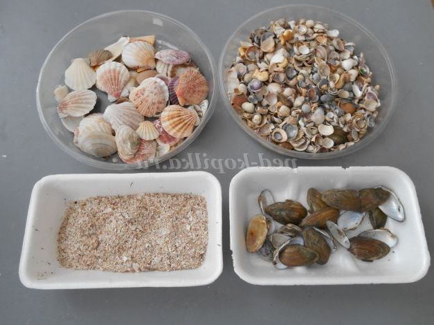 - черепашки різних видів (морські гребінці, сердцевидка, мідії), річковий пісок, камінчики;