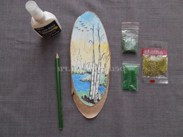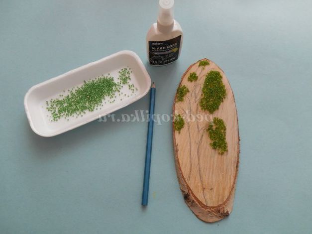 Візьміть необхідний вам бісер і з допомогою клею ПВА приклейте його, зображуючи листя, квіти, кущі, берег річки.