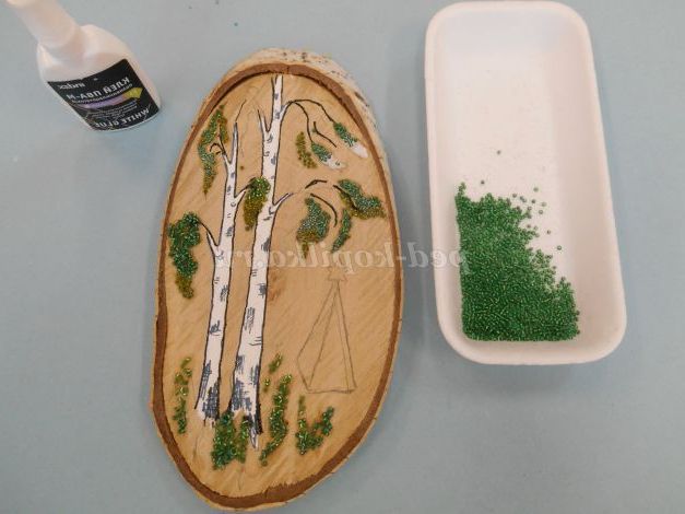 Змащуємо клеєм місця нанесення бісеру. Акуратно наносимо бісер на клей, зображуючи листя. Під берізкою «виростає» зелена трава.
