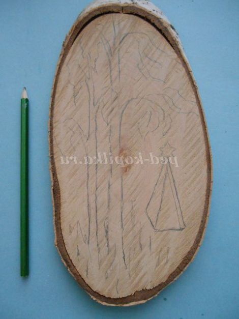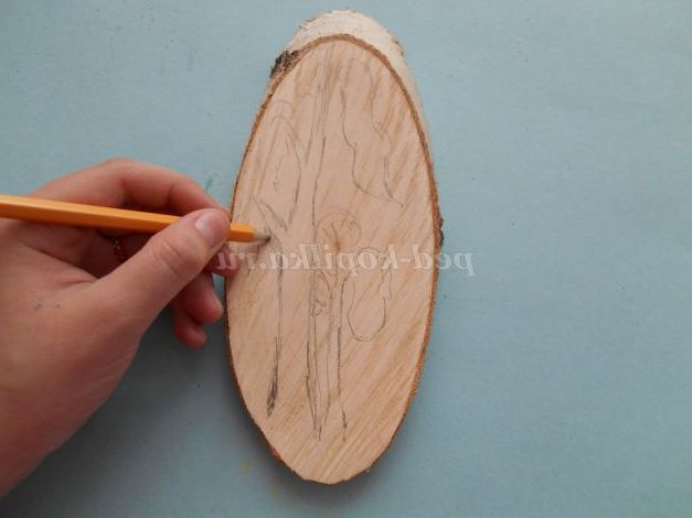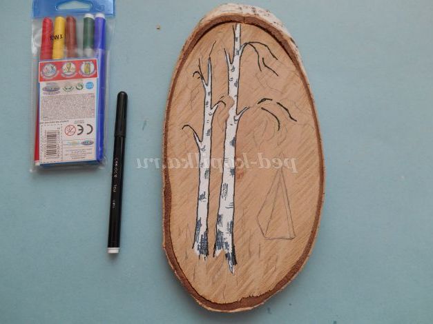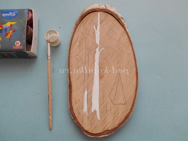 Можна виконати панно в кольорі. Спочатку пофарбуйте зріз білою гуашшю. Потім зобразіть фон, намалюйте олівцем ескіз майбутньої картинки. Прорисуйте всі дрібні деталі. Розфарбуйте панно.