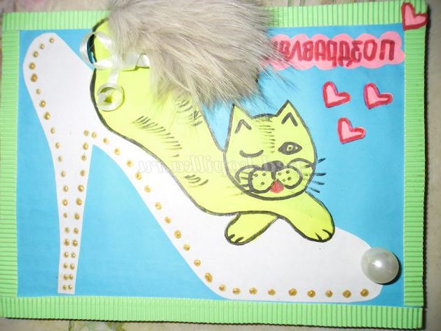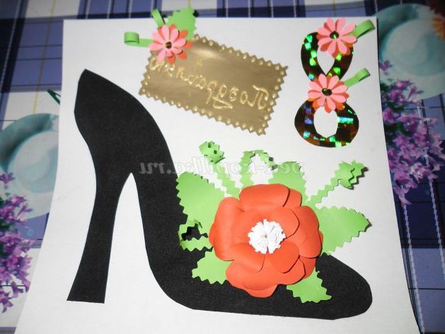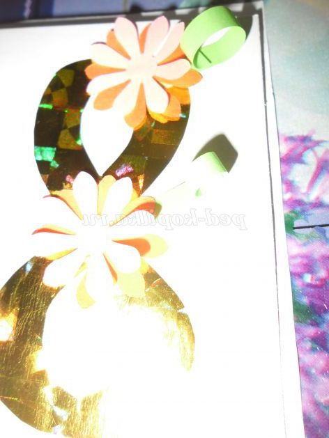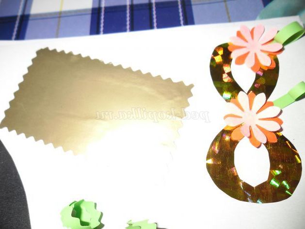 6. З блискучою кольорового паперу вирізаємо цифру 8. Додаємо для краси закручені вусики