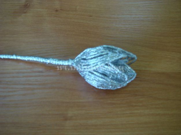 Збірка квітки: складаємо пелюсточки разом, беремо дротик і обвиває все хвостики поступово опускаючись вниз, таким чином формуючи стовбур.